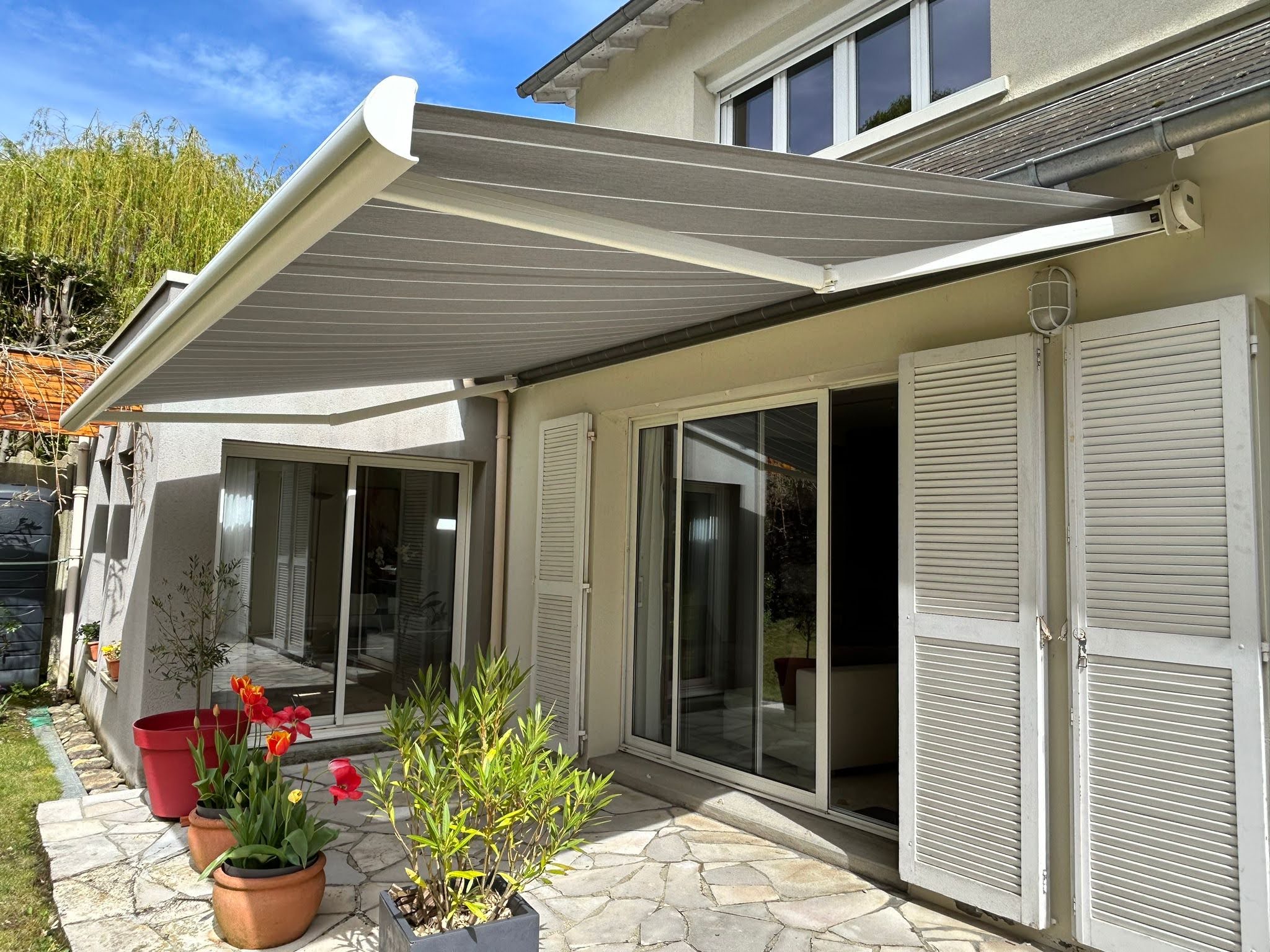 Robuste et esthétique, le store banne offre un confort inégalé tout en valorisant vos espaces extérieurs. Forts de plus de 4500 projets réalisés, nous mettons notre expertise à votre service pour concevoir et installer un store banne parfaitement adapté à vos besoins. Nos poseurs qualifiés assurent une installation durable, couverte par une garantie de 5 ans sur la pose, en complément de la garantie fabricant.